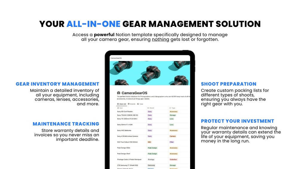 - Comprehensive Template: Access a powerful Notion template specifically designed to manage all your camera gear, ensuring nothing gets lost or forgotten.
