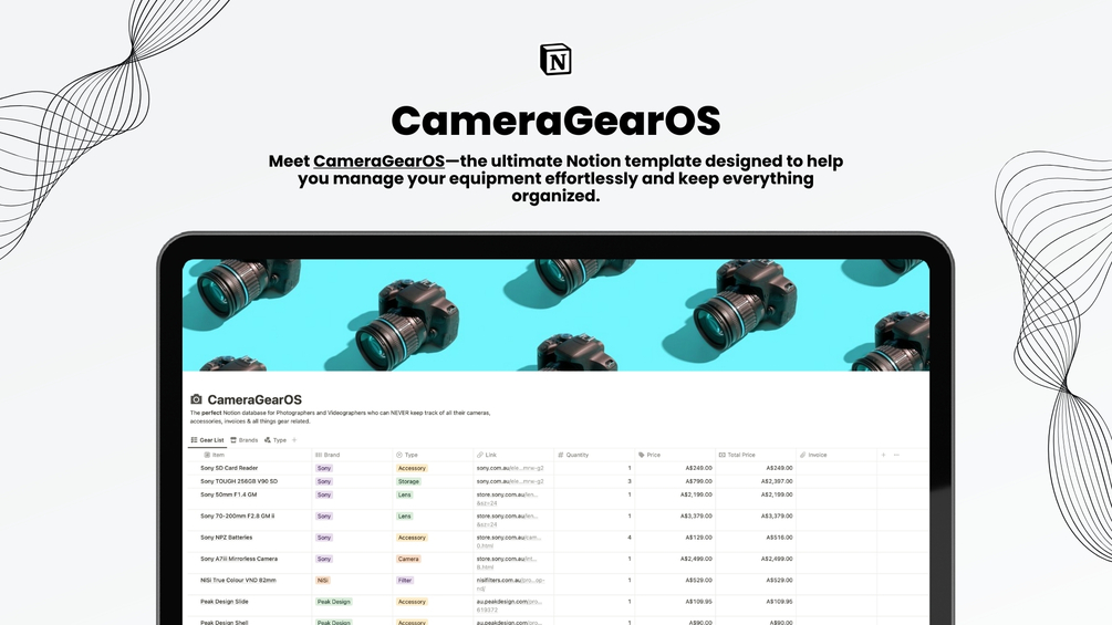 Meet CameraGearOS—the ultimate Notion template designed to help you manage your equipment effortlessly and keep everything organized. Whether you're a professional or an enthusiast, CameraGearOS has you covered.